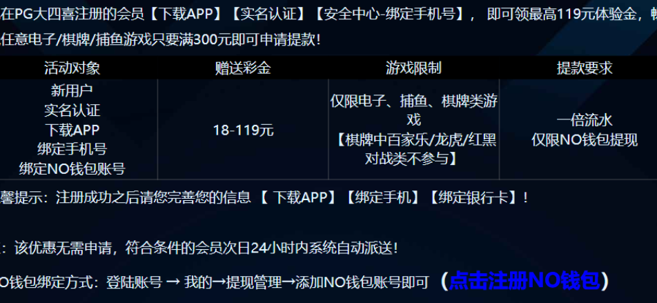 活动详情:新用户下载app绑定完善个人资料+NO钱包,只能绑一个账号,24小时内系统自动送18-119。