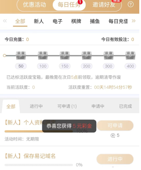 活动详情:新用户注册完善个人信息 优惠每日任务 先领五元 上面域名点击保存领三元 共计八元