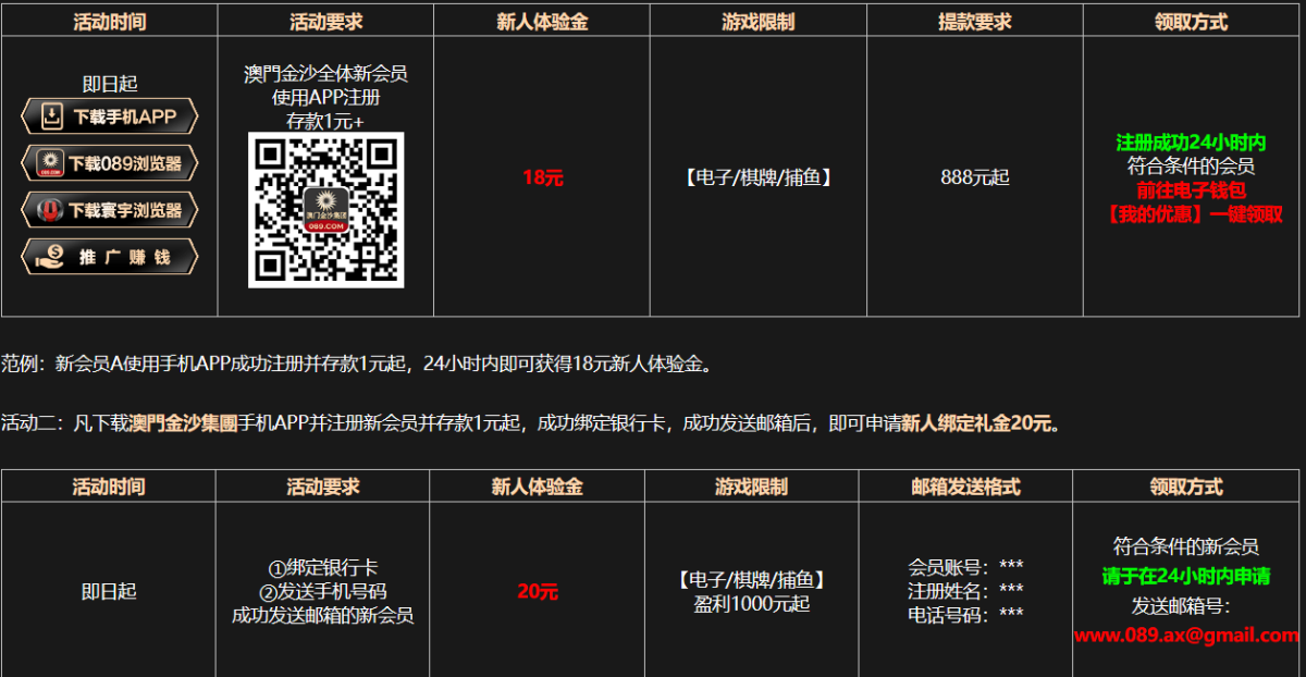 活动详情:注册绑定银行卡下载app首存1元自动送18,然后发送邮件申请20元app彩金。详看优惠活动。
